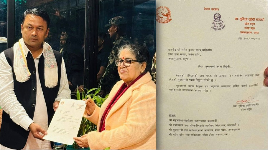 जनकपुरधाम, कार्तिक २४ गते । संविधानको धारा १६८ को उपधारा (३) बमोजिम नेकपा (एमाले) मधेश प्रदेश संसदीय दलका नेता सरोज कुमार यादवलाई मधेश प्रदेशको नयाँ मु..