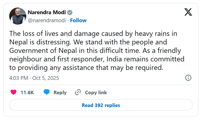 नेपालको विपत्तिमा भारतसँगै: मोदीले जनाए दुःख र सहयोगको प्रतिवद्धता