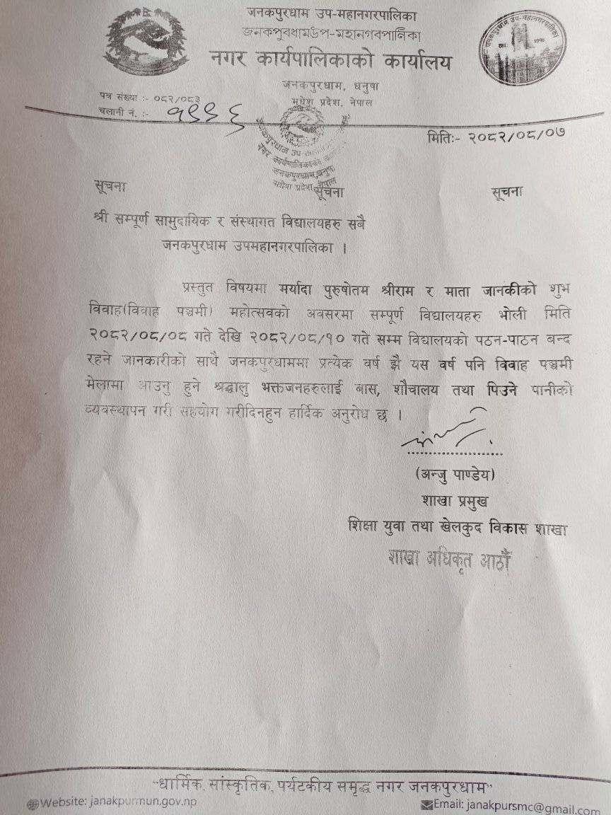 जनकपुरधाम, मंसिर ७ गते । जनकपुरधाम उपमहानगरपालिकाले आगामी विवाहपञ्चमी महोत्सवलाई ध्यानमा राख्दै उपमहानगरभित्रका सबै सामुदायिक तथा संस्थागत विद्यालय तीन दिनका लागि बन्द गर्ने निर्णय गरेको छ। उपमहानगरले जारी गरेको सूचनाअनुसार मिति २०८२/०८/०८ देखि २०८२/०८/१० सम्म नियमित पठन–पाठन बन्द रहनेछ।