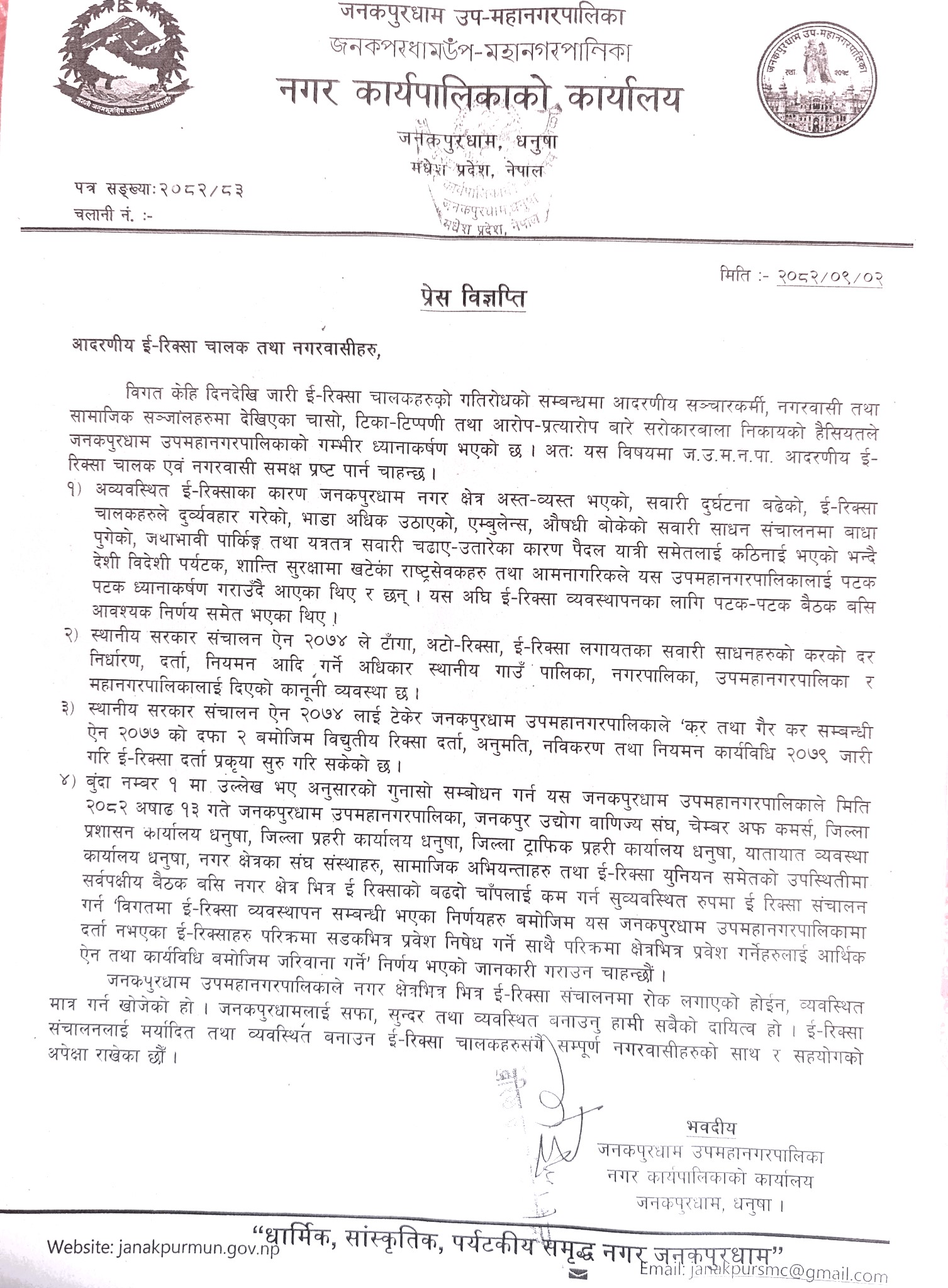 जनकपुरधाम उपमहानगरपालिकाको प्रेस विज्ञप्ति : ई-रिक्सा संचालनमा रोक होइन, व्यवस्थापन मात्र