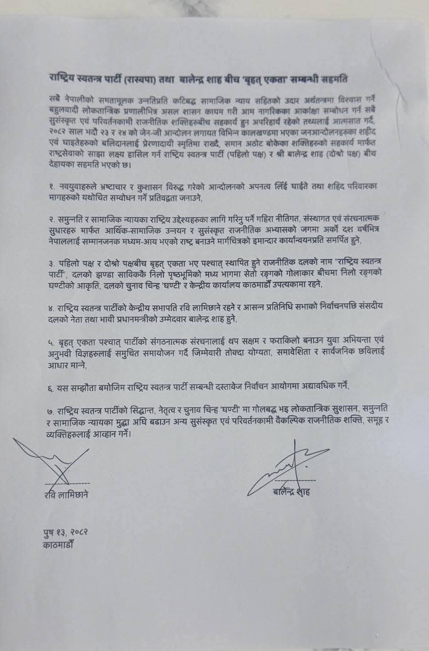 काठमाडौं, पुष १३ गते । राष्ट्रिय स्वतन्त्र पार्टी (रास्वपा) का सभापति रवि लामिछाने र काठमाडौं महानगरपालिका मेयर बालेन्द्र शाह (बालेन) बीच 'बृहत् एकता' सम्बन्धी लिखित सहमति भएको छ । पुस १३ गते काठमाडौंमा हस्ताक्षरित यो सहमतिले जेनजी आन्दोलनको बलिदानलाई स्मरण गर्दै सुशासन, समुन्नति र सामाजिक न्यायका लागि साझा अठोट व्यक्त गरेको छ ।