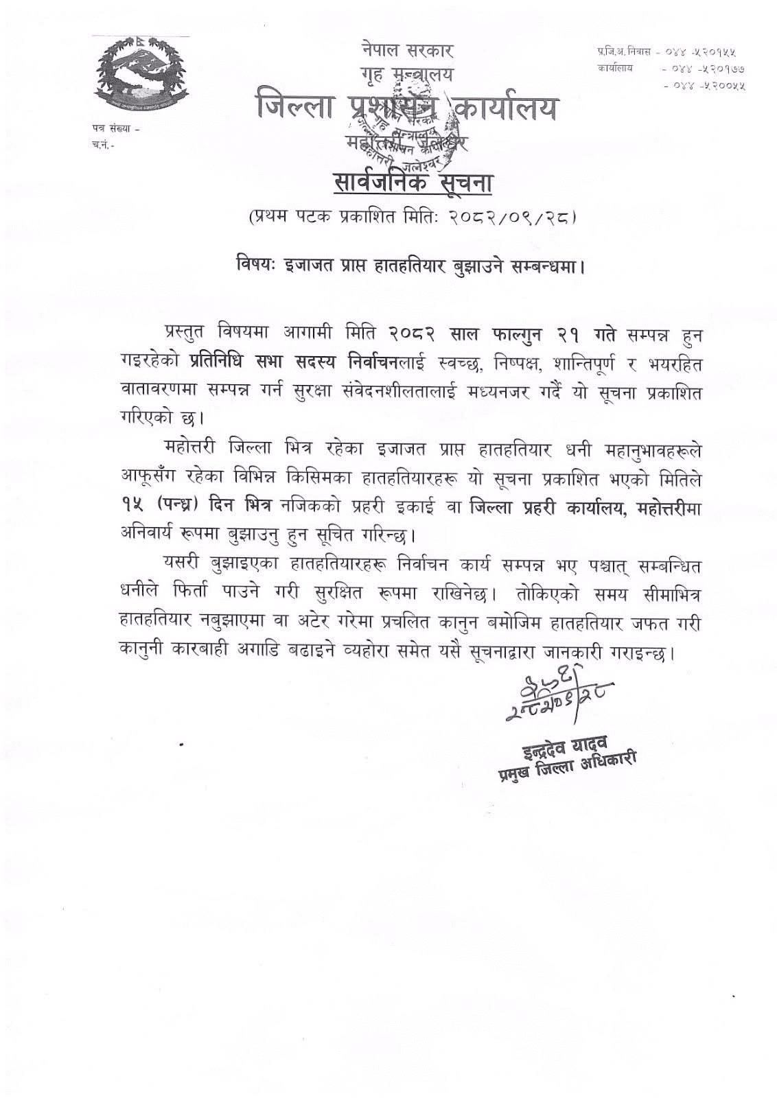 प्रमुख जिल्ला अधिकारी इन्द्रदेव यादवद्वारा जारी प्रथम पटकको सार्वजनिक सूचनामा यो सूचना प्रकाशित भएको मितिले १५ (पन्ध्र) दिनभित्र महोत्तरी जिल्लाभित्र रहेका सबै इजाजत प्राप्त हातहतियार धनीहरूले आफूसँग रहेका विभिन्न किसिमका हातहतियारहरू नजिकको प्रहरी इकाई वा जिल्ला प्रहरी कार्यालय महोत्तरीमा अनिवार्य रूपमा बुझाउन सूचित गरिएको छ।