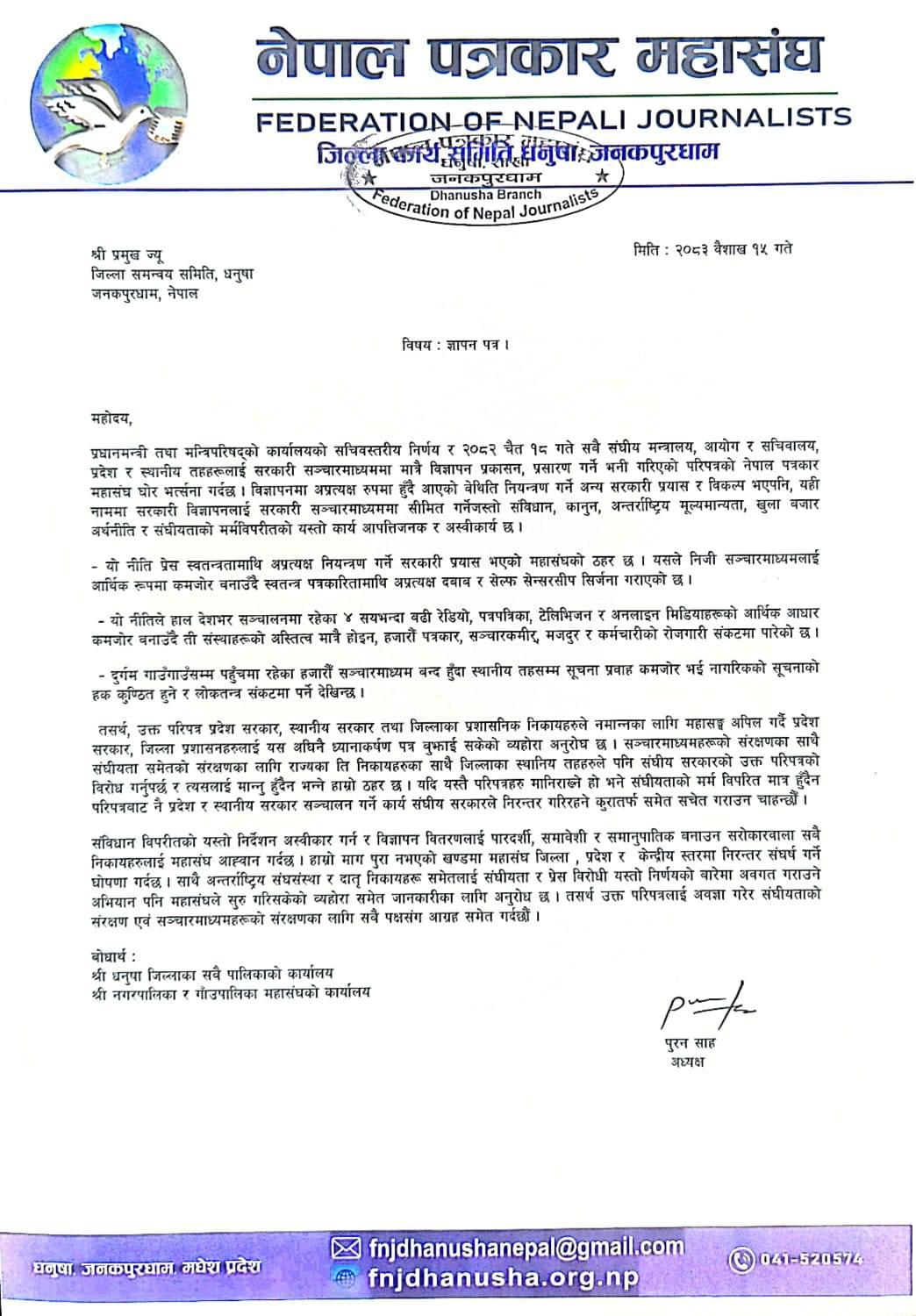 महासंघले विशेषगरी संघीय सरकारले सरकारी मिडियालाई मात्र विज्ञापन दिने नीतिको विरोध गर्दै यसले निजी तथा स्वतन्त्र सञ्चारमाध्यमलाई कमजोर बनाउने खतरा रहेको जनाएको छ। महासंघ धनुषाका अध्यक्ष पुरन साहको नेतृत्वमा गएको टोलीले जिल्ला समन्वय समिति धनुषाका प्रमुख राजनन्दन मण्डललाई पत्र बुझाउँदै पत्रकारको सुरक्षा, अभिव्यक्ति स्वतन्त्रता र समान विज्ञापन वितरणको माग गरेको हो। महासंघले पत्रकारमाथि बढ्दै गएको दमन, धम्की र असुरक्षाप्रति चिन्ता व्यक्त गर्दै स्थानीय तहहरूलाई पत्रकारमैत्री वातावरण निर्माण गर्न आग्रह गरेको छ।